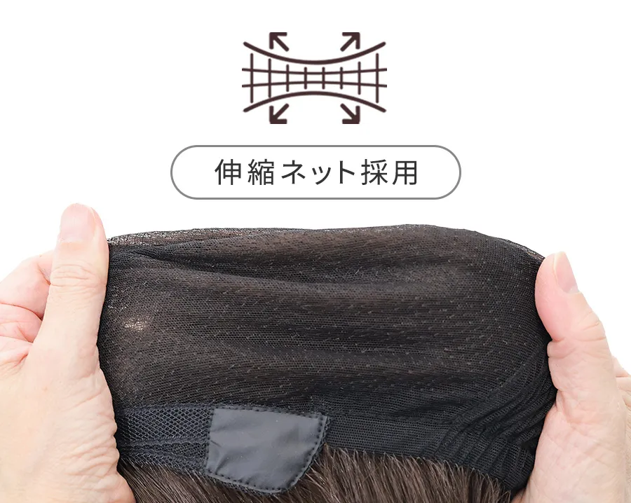 柔らかい伸縮ネットを採用。通気性も良くいつまでもつけていたいほどやさしい肌あたり。自髪の増減による頭のサイズ変化にも対応します。