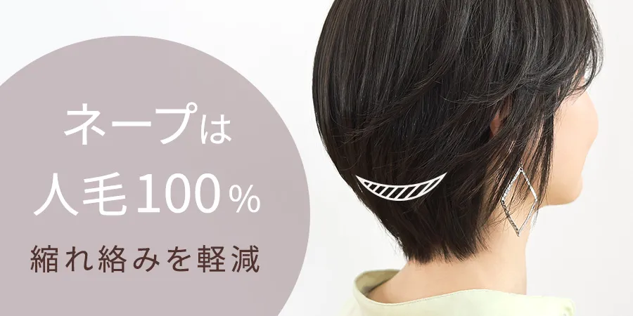 摩擦を起こしやすいネープ部分には人毛のみを使用。静電気による縮れや絡みが軽減され、ウィッグを長くご愛用いただけます。